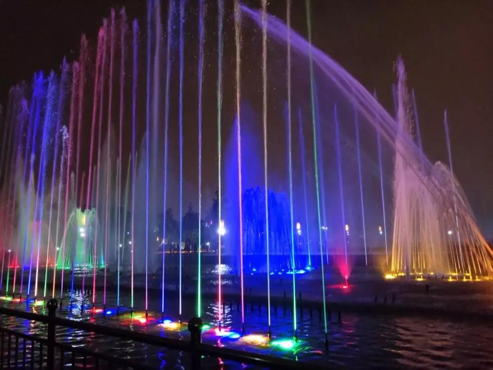 夜幕降臨,音(yīn)樂(yuè)噴泉、鐘(zhōng)<£樓、鼓樓的(de)燈光(guāng)一(yī)齊亮(liàng)起, ÷十分(fēn)壯觀。